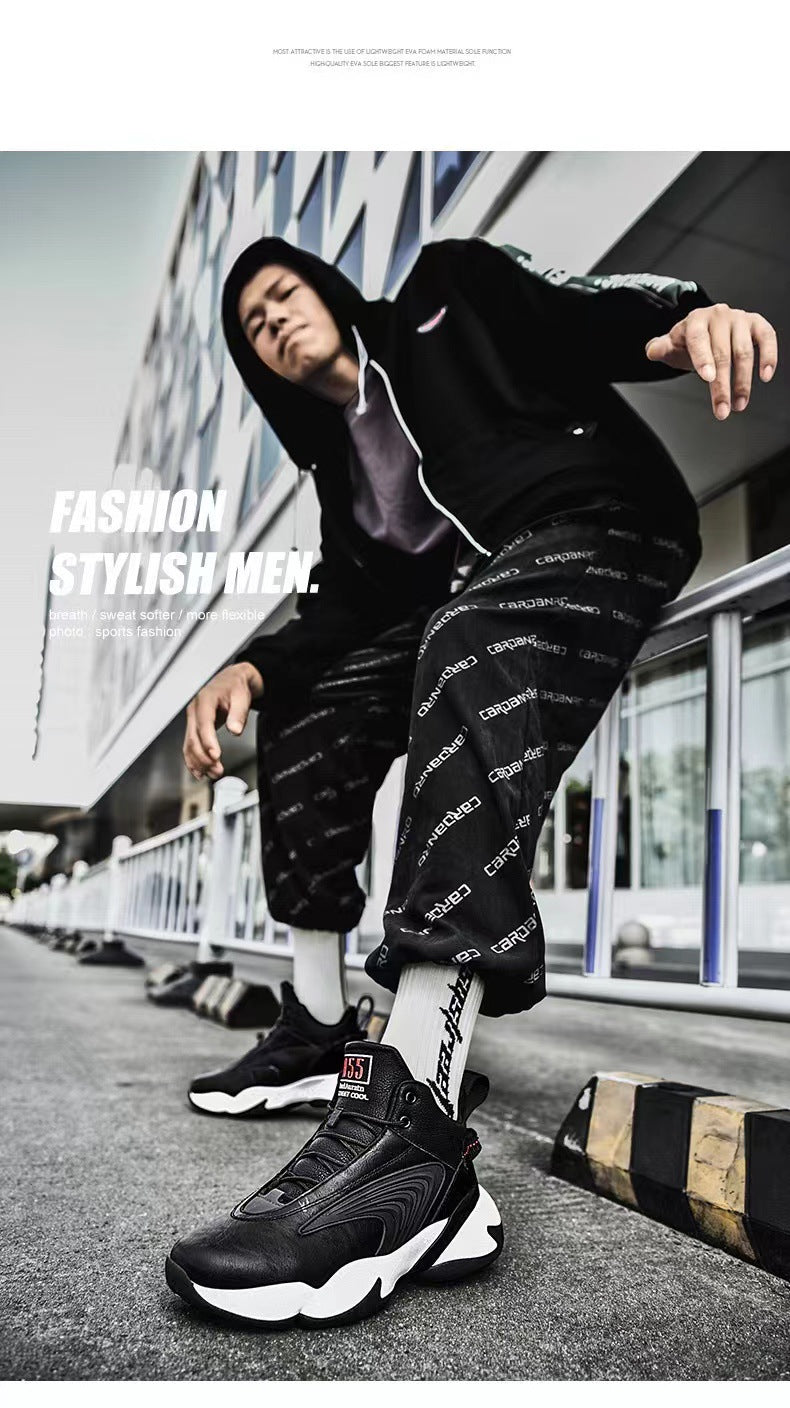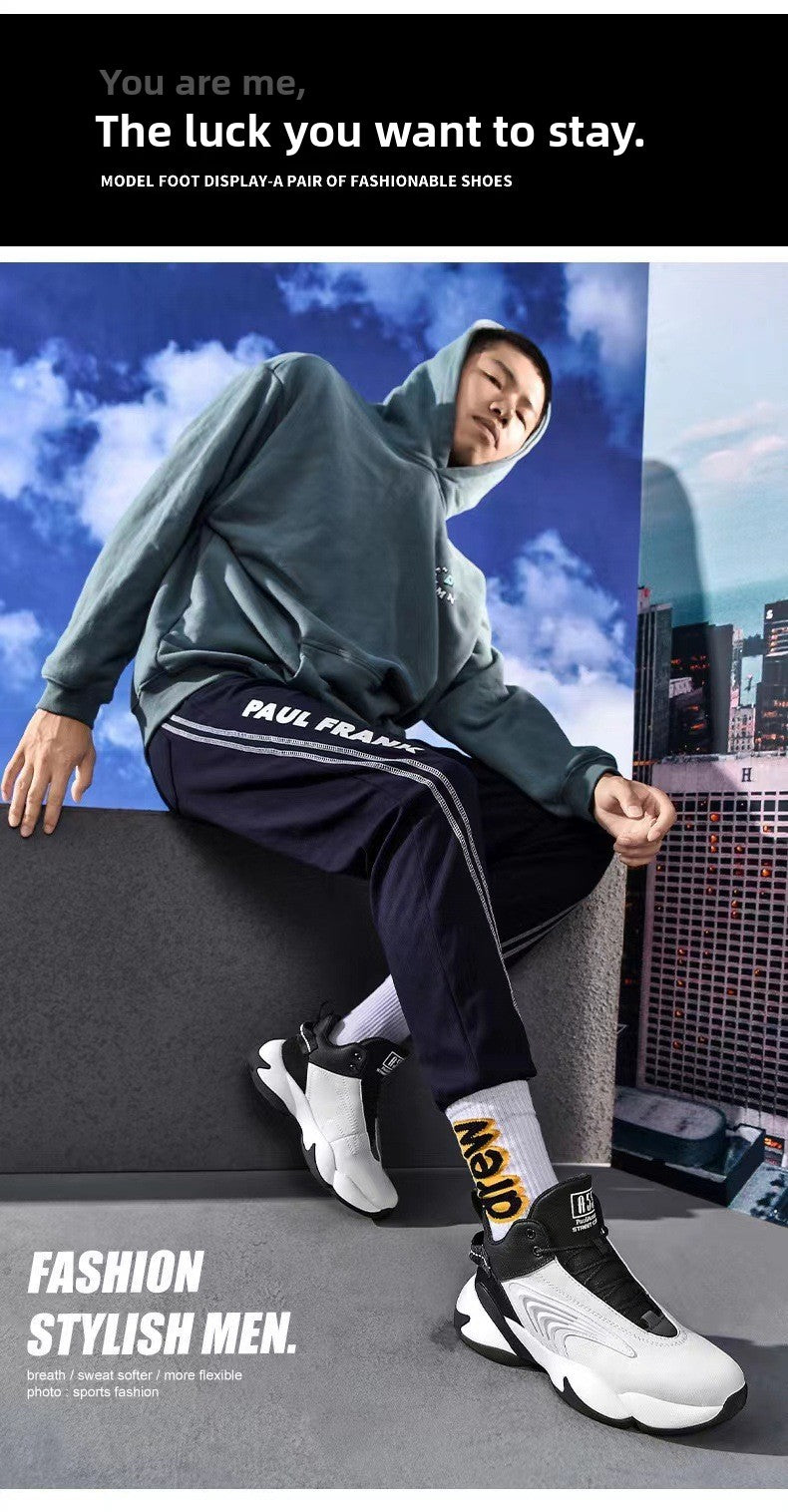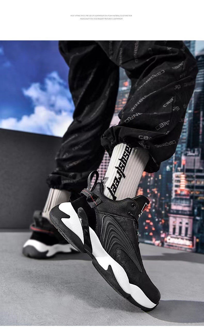 These youth basketball shoes feature a sturdy synthetic leather upper and a thick PVC sole for long-lasting durability. The anti-slip design enhances traction, making them ideal for sports activities. Inside, a breathable mesh lining combined with an EVA insole ensures comfort and ventilation during extended wear. Their low-top silhouette with a mid-heel height of 3-5 cm offers added height while maintaining a secure fit with lace-up closure. Available in white and black, these versatile shoes suit both basketball performance and casual style, fitting European sizes 39-44.