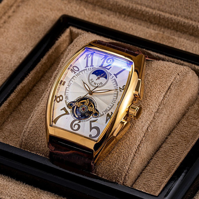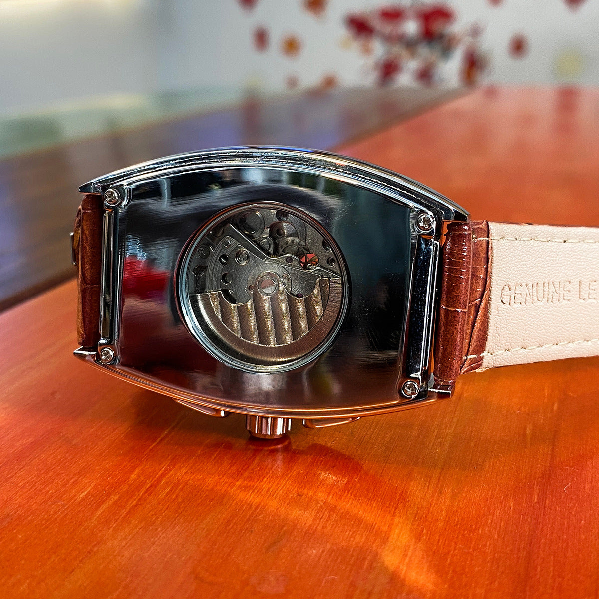 This barrel-shaped fully automatic skeleton mechanical watch combines sophisticated engineering with a distinctive design, perfect for the modern man. Its transparent dial reveals the intricate inner workings, highlighting craftsmanship while offering multifunctional precision. Ideal for business casual settings, this stylish timepiece blends functionality with elegance, making it a reliable accessory no matter the occasion.