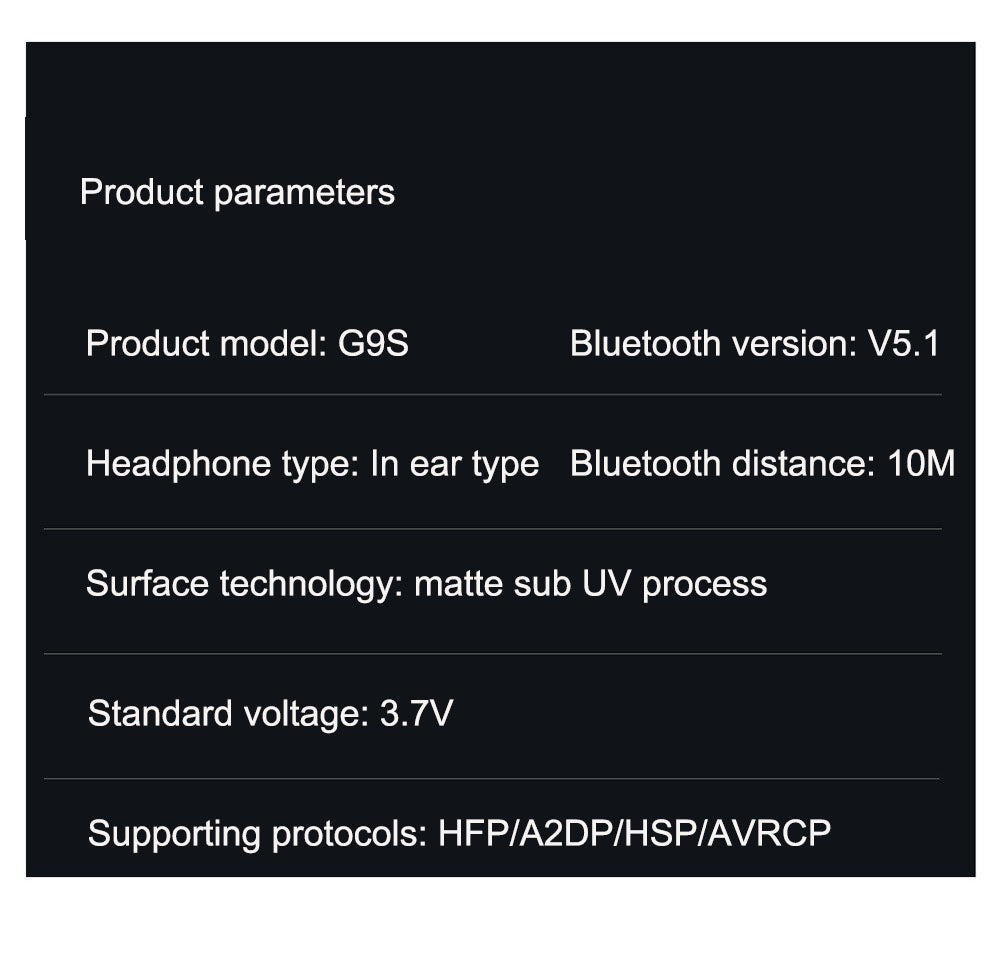 The G9S Bluetooth Earphones offer exceptional stereo sound and wireless freedom with Bluetooth 5.1 technology and a 10-meter range. Their 40 mAh polymer lithium battery supports up to 3.5 hours of continuous playback, recharging fully in 1.5 hours via the compact 300 mAh charging case. With high-sensitivity microphones delivering clear hands-free calls, these TWS earphones support multiple Bluetooth profiles including Headset, Handsfree, A2DP, and AVRCP for versatile audio control. Designed in sleek black, the in-ear earbuds are lightweight and ideal for sports and everyday use, combining portability with advanced functionality and a convenient battery display.