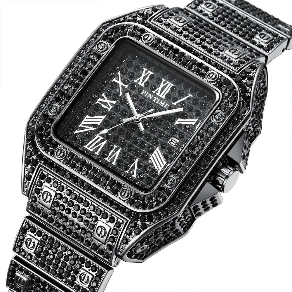 This luxurious men's wristwatch combines a bold square design with sparkling diamonds for a standout hip hop style. Crafted from durable gold-tone steel, it features precise quartz movement and a classic Roman numeral calendar display. Ideal for those seeking a sophisticated yet edgy accessory that merges functionality with high-end fashion.