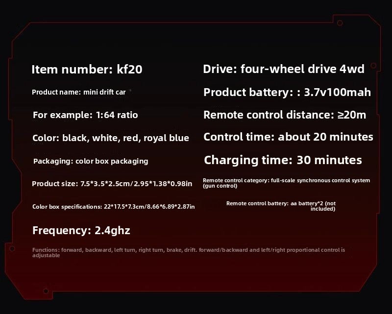 The Mini RC Drift Car offers a compact 1:64 scale design ideal for desktop play and convenient storage. Equipped with four-wheel drive, it delivers high-speed, smooth drifting performance. The wireless handle remote ensures precise control for an engaging experience. Crafted from durable plastic, it comes in retro blue, red, black, and white to suit your style.