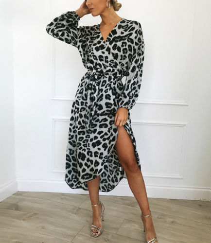 Women Wrap Leopard Printed Boho Long Maxi Dress Casual Bandage Bodycon Long Sleeve V Neck Loose Club Wear Dresses